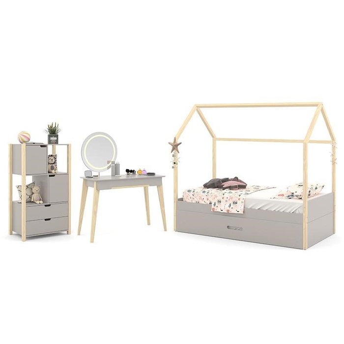 Jogo de Quarto Infantil Kids Liv Organizador, Cama, Auxiliar New e Penteadeira Tifanny LED Cinza/Nat
