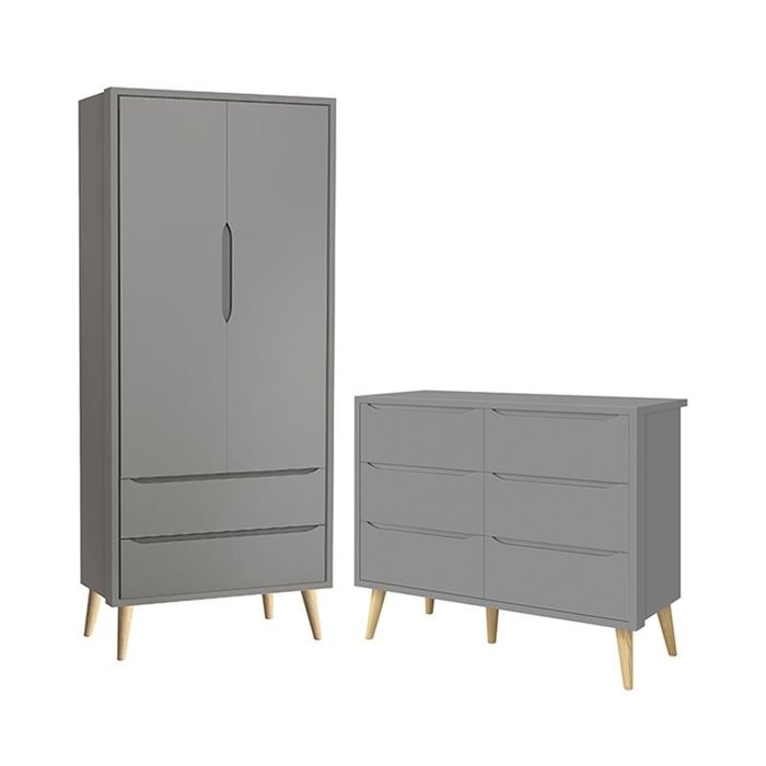 Jogo de Quarto Infantil Theo Guarda Roupa 2 Portas e Cômoda 6 Gavetas Cinza Fosco com Pés Madeira Na