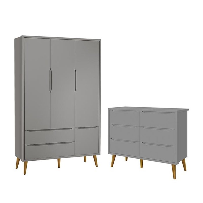Jogo de Quarto Infantil Theo Guarda Roupa 3 Portas e Cômoda 6 Gavetas Cinza Fosco com Pés Amadeirado