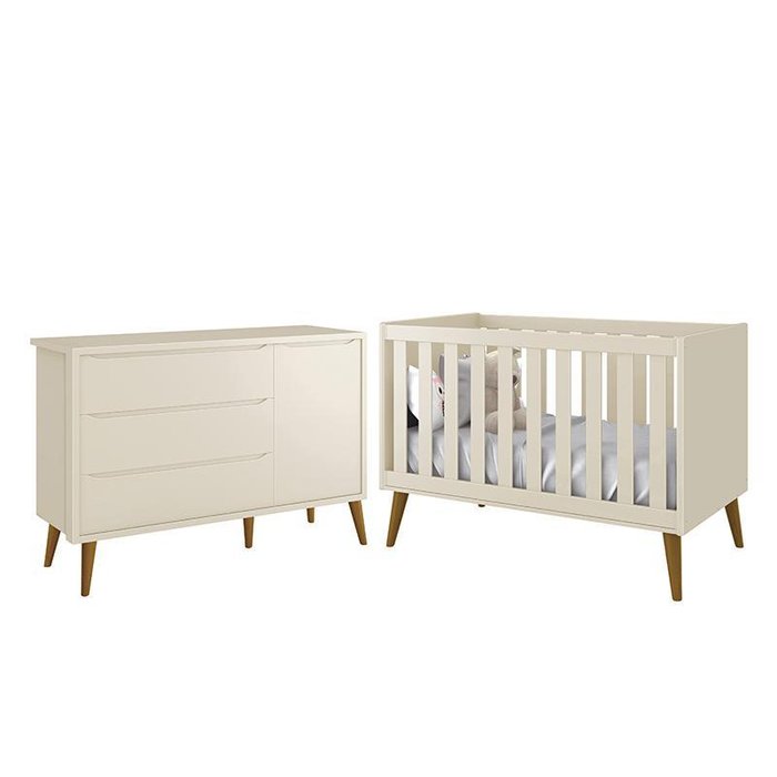 Jogo de Quarto Infantil Theo Retrô Cômoda 1 Porta e Berço Areia Fosco com Pés Amadeirado -