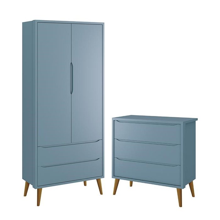 Jogo de Quarto Infantil Theo Retrô Guarda Roupa 2 Portas e Cômoda Azul com Pés Amadeirado - Reller M