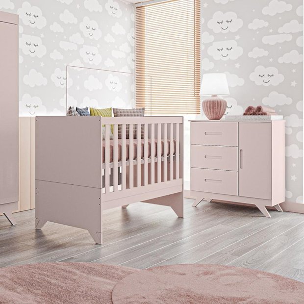 Jogo de quarto Maya Rose Cômoda e BerçoQue tal um conjunto, com um estilo clean e totalmente funcional.Apresentamos o Conjunto Maya, composto por peças de ótima qualidade. Produzido com estrutura 100% em Mdf, conta com acabamento em pintura UV atóxica para mais durabilidade e resistência. O Berço é certificado pelo Inmetro, ótimo para quem busca segurança e conforto, a grade removível trás praticidade, para que o berço seja aproveitado durante o crescimento da criança. Acompanha suporte para mosquiteiro e é para colchão de padrão americano. A Cômoda conta com um ótimo espaço interno, para organizar as roupas e acessórios do seu bebê, mantendo o quartinho sempre lindo e em ordem. Dimensão: