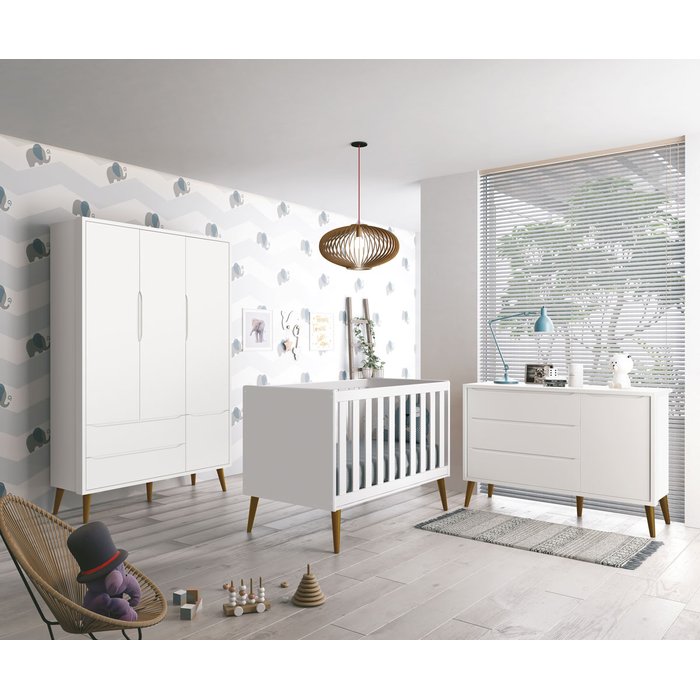 O Jogo de Quarto Bebê 3PTs Theo New - RELLER, é ideal para o quartinho do seu baby. Possui pés em madeira maciça no estilo palito que contribuem para o ar retrô, as peças detém de um desing clean que combinam com vários estilos de decoração. Contempla um Berço que exala personalidade e delicadeza, podendo trnasformar-se em mini cama futuramente, uma Cômoda Sapateira com três gavetas e uma porta, e um Roupeiro de três portas e duas gavetas, super amplos, espaçosos e com divisórias internas, são ideais para uma perfeita organização das roupinhas e itens do seu bebê.
