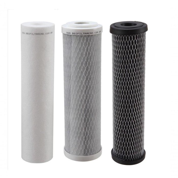 Um refil de polipropileno 5 micra na entrada, um refil Carbon Block e um Carvão ativado em manta (celulose com carvão impregnado modelo C1 Pentek).