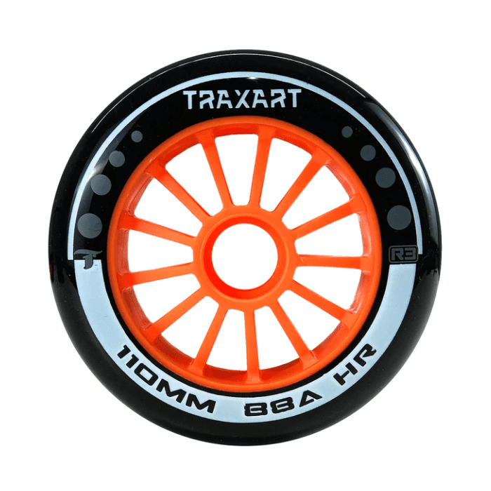 Jogo de 3 rodas Traxart Revolt R3 110mm/88A HR (high rebound) em 110mm, com dureza 88A HR e fabricadas em poliuretano (PU).