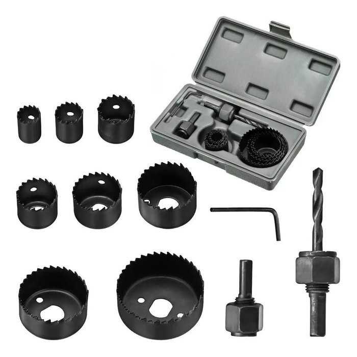 Composição: Diversas serras copo, mandril com broca piloto, chave Allen e adaptadores