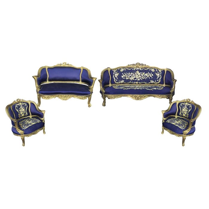 Jogo de sofá na cor azul, composto por 2 sofás de 2 e 3 lugares respectivamente, e 2 poltronas. Produzido em madeira com entalhes a mão, folheado a ouro. Encostos e assentos estofados.