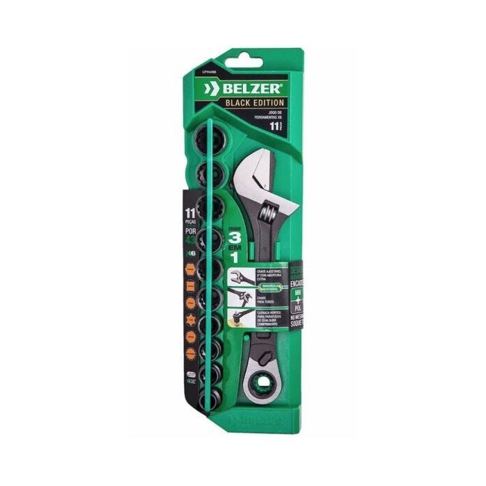 Jogo de Soquete Belzer Vortex X6 + Chave 3 em 1 - CPTAW8B Descrição Jogo de soquetes e 1 chave 3 em 1 Acabamento em Black Edition Ferramentas fabricadas em aço cromo vanádio com tratamento térmico especial para garantir melhor resistência Sistema X6 multi encaixe que possibilita encaixe para todos os tipos de parafusos Catraca vortex para parafusos de qualquer comprimento Design especial para maior torque e mais conforto Possui mandíbula reversível para usar como: chave ajustável e chave de cano Acompanha estojo organizador versátil: perfeito para expor no painel de ferramentas ou armazenar em caixas e carrinhos Alta resistência á corrosão Possui medidas nos soquetes em milímetros e polegadas 11 Peças que valem por 43 peças Composição: 1 Chave 3 em 1 que possui as funções de: Chave ajustável de 8" Chave para tubos e Catraca para soquetes - 10 Soquetes de: 10mm (3/8"), 11mm (7/16"), 12mm (15/32"), 13 (1/2"), 14mm (9/16"), 15mm (19/32"), 16mm (11/16"), 17mm (11/16"), 18mm (23/32") e 19mm (3/4")