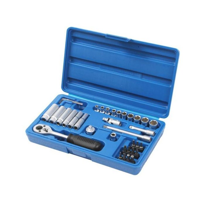 O Jogo de Soquete Sextavado é um modelo de alta qualidade para trabalhos manuais que requerem a utilização de soquetes. O kit é composto por 36 peças, todas com encaixe de 1/4" e fabricadas em aço cromo vanádio (CR-V), um material resistente e durável que confere maior vida útil às ferramentas.
