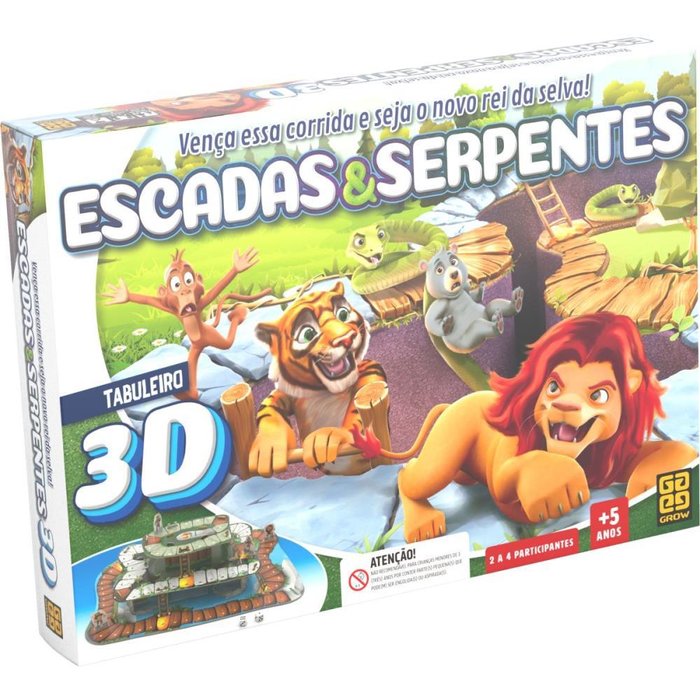O clássico jogo de Escadas e Serpentes com uma cara totalmente nova! Em um tabuleiro com três níveis diferentes as crianças vão ter q subir escadas e evitar cair pelas serpentes para chegar ao topo e ser o novo Rei da Selva! Embalagem: UNIDADE