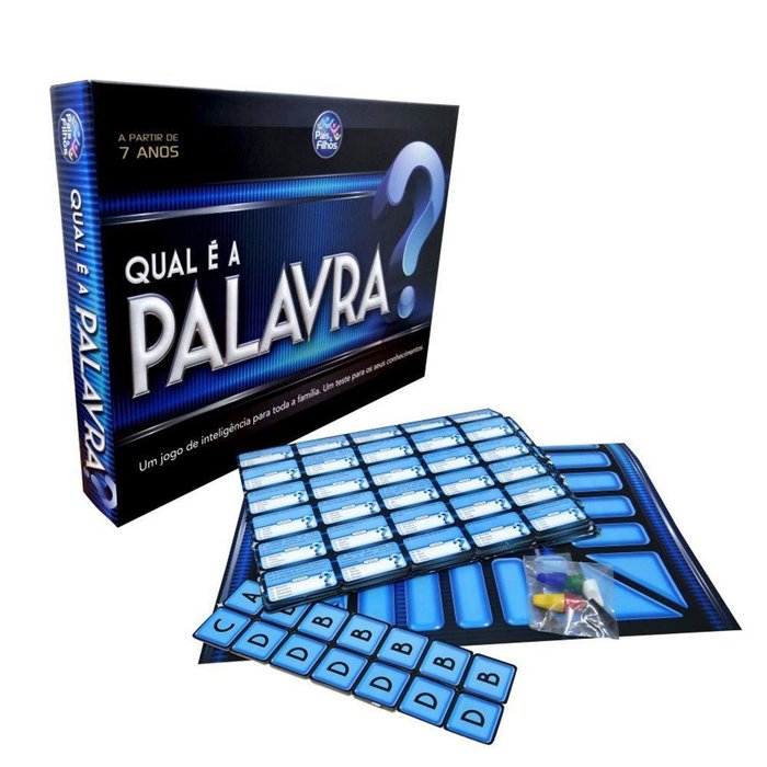 Jogo de Tabuleiro Infantil - Qual é a Palavra? - Pais e Filhos: divertido teste de conhecimento, Qual é a Palavra? é um ótimo jogo de tabuleiro para reunir a família e amigos. São 480 cartas para aprender o significado das palavras. Com o Jogo Qual é a Palavra? todo mundo participa de uma emocionante disputa e aprende brincando. Um super jogo que vai testar o seu vocabulário e contribuir para o seu conhecimento. Aprenda o significado de diversas palavras curiosas jogando! - Como Jogar Qual é a Palavra??- Cada jogador escolhe um pino e o coloca no início do tabuleiro;- Embaralhe todas as cartas e coloque-as empilhadas no tabuleiro, com o texto para baixo, no campo correspondente às cartas;- Distribua as 4 fichas com as alternativas A, B, C e D para cada jogador;- Sorteie quem vai começar o jogo;- O primeiro jogador retira a primeira carta do monte e, sem que os outros jogadores vejam, lê em voz alta a palavra, diz quantos pontos ela vale e, em seguida, lê seus possíveis signicados;- Os outros jogadores escolhem qual alternativa acham correta e separam a ficha correspondente sem que os adversários a vejam, deixando as demais opções de letras viradas para baixo, sobre o tabuleiro;- Depois de escolhidas as alternativas, todos os jogadores viram as fichas selecionadas com a resposta. Quem acertou, desloca-se pelo tabuleiro o número de pontos marcado na carta, quem errou não ganha pontos. Se nenhum dos jogadores acertar, o jogador que leu a carta ganha os pontos e anda o correspondente com seu pino pelo tabuleiro;- Passe a vez para o próximo jogador ler a carta, e assim por diante;- Ganhará o jogo quem primeiro completar o percurso do tabuleiro. Seja esperto! Não deixe seus adversários perceberem qual a alternativa correta.INFORMAÇÕES:- Produto: Jogo Qual é a Palavra?- Marca: Pais e Filhos- Coleção: Jogos Top Line Pais e Filhos- Tipo: Jogo de Tabuleiro- Categoria: Jogos e Tabuleiros- Participantes: de 2 a 6 jogadores- Objetivo: ser o primeiro a completar o percurso do tabuleiro- Conteúdo: 1 tabuleiro, 6 Pinos Plásticos, 480 Cartas em Cartão; 24 Fichas com Alternativas (A,B,C,D)- Recomendação: para crianças a partir de 08 anos de idadeESPECIFICAÇÕES:- Referência: 2750- Código de Barras: 7896647027509- Embalagem (C x A x L): 44.5 x 32.5 x 60 cm- Embalagem (Peso): 0.680 kg- Composição / Material: Plástico e Cartonado - Registro: CE-BRI/ICEPEX-l 01883-25 - Certificado: Órgãos Autorizados - OCP´S (Organismos de Certificação de Produtos) BENEFÍCIOS DE BRINCAR:- Eleva a autoestima- Estimula o raciocínio- Exercita o imaginário- Desenvolve a criatividade- Desenvolve percepção visual - Desperta a atenção e curiosidade- Desenvolvimento neuropsicológico- Estimula habilidades motoras básicas- Incentiva a comunicação e linguagem- Estimula o desenvolvimento psicomotor- Desenvolve aspectos emocionais e afetivos- Melhora a qualidade do sono e o sistema imunológicoAVISO: - As imagens são meramente ilustrativas- Os tamanhos e medidas são aproximados- As cores e estampas dos produtos podem ter variações- As informações são de responsabilidade do fabricante ou fornecedor