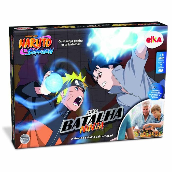 JOGO DE TABULEIRO - NARUTO SHIPPUDEN - BATALHA NINJA - ELKA : a Quarta Grande Guerra Ninja começou! O futuro de todas as vilas está em suas mãos. Quem encontrar Naturo primeiro no campo de batalha adversário ou deixar o oponente sem movimentos válidos, ganha. Utilize as peças para avançar no território rival ganhando área e eliminando o máximo de peças possíveis do outro jogador. Escolha sua estratégia ao posicionar as peças, desafiando seu oponente. Conquiste o poder ninja! Cada exército possui 4 times + o Naruto.