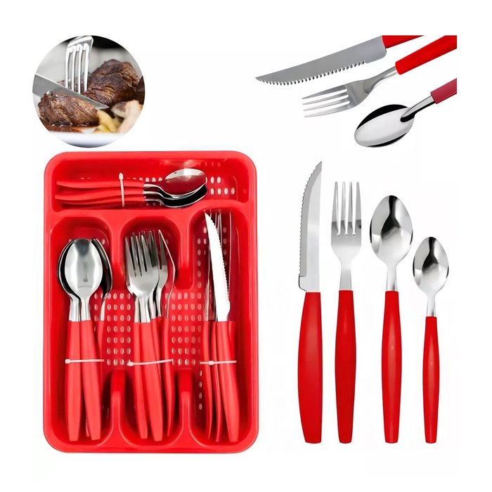 Jogo de Talheres de Aço Inox com Gaveteiro - 24 Peças Vermelho