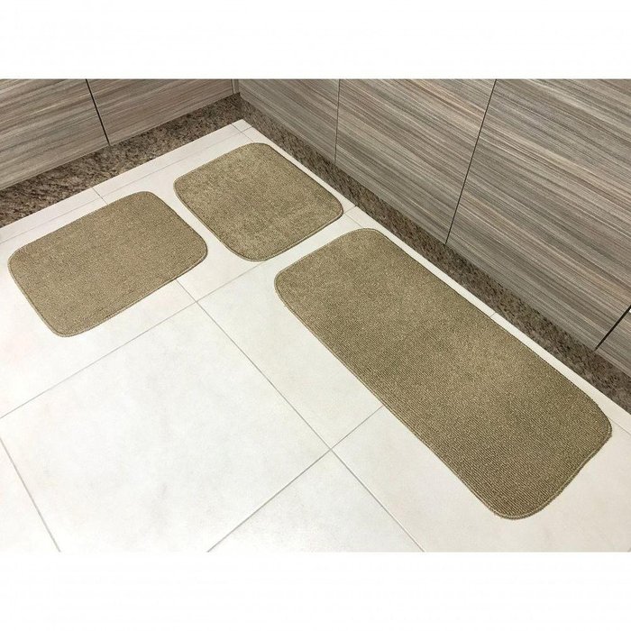 - Tapetes: 2 Tapetes 40cm x 60cm; 1 Trilho 40cm x 120cm; Superfície: 100% Poliéster; Base: Látex