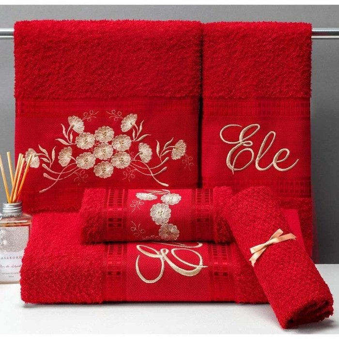 Jogo de Toalhas de Banho Aline Bordado 05 Peças 100% Algodão - Vermelho