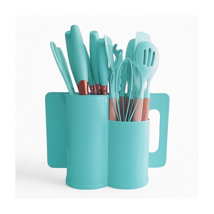 Jogo de Utensílios para Cozinha 19 Peças em Silicone com Cabos de Madeira e Suporte Oval - Ciano