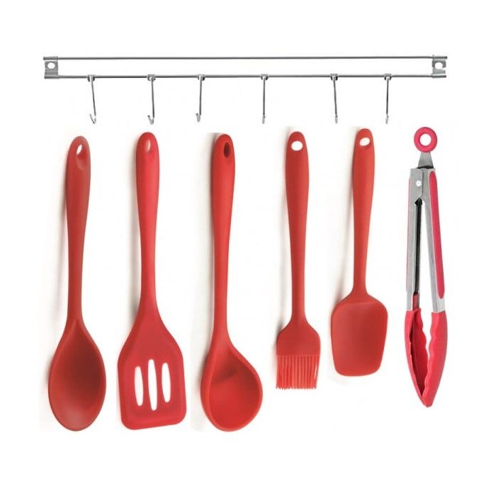 Jogo De Utensílios Silicone Vermelho Premium 6 Peças E Suporte Inox Para Parede - Mimo Style
