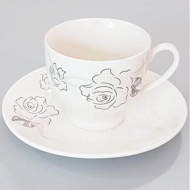Jogo de Xícaras e Pires 12 Peças Estampa Rosa Branco