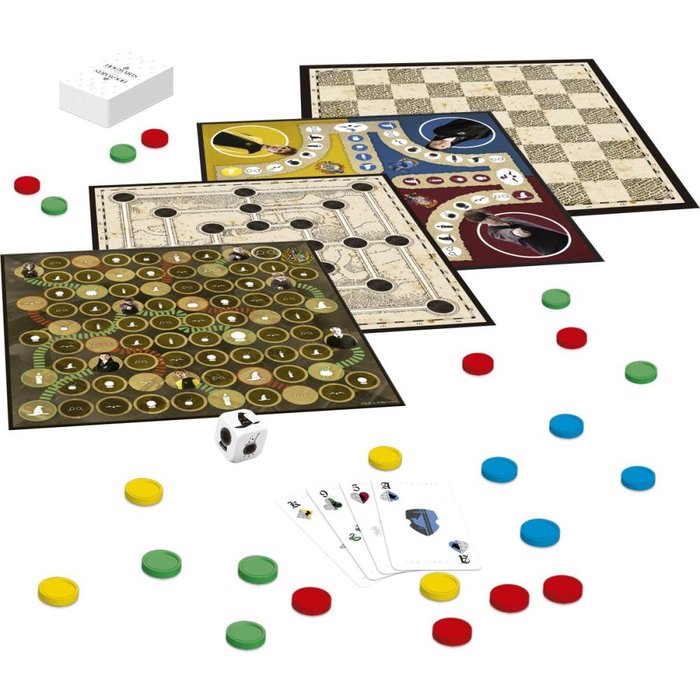 Aproveite este incrível kit de jogos tradicionais com toda a magia de Harry Potter e seus amigos. São 4 jogos de tabuleiros diferentes (Dama, Ludo, Trilha, Sobe e Desce) e 1 baralho para você jogar com sua família ou amigos, embarcando nessa aventura para Hogwarts!