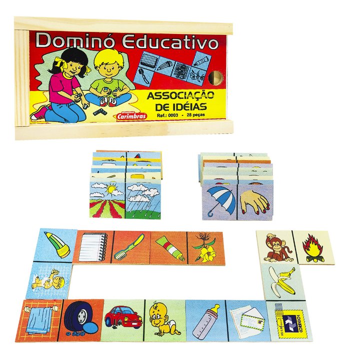 O jogo de Dominó Associação de Ideias modelo 0003 da Carimbras, é composto por 28 peças com temas variados acondicionadas em uma caixa tipo estojo. O jogo pedagógico tem como principal objetivo, além de ganhar ficando sem peças na mão, aprender sobre as imagens e suas associações. Feito em madeira, este brinquedo educativo trabalha a memorização, coordenação motora e raciocínio, e é indicado para crianças a partir de 3 anos de idade.