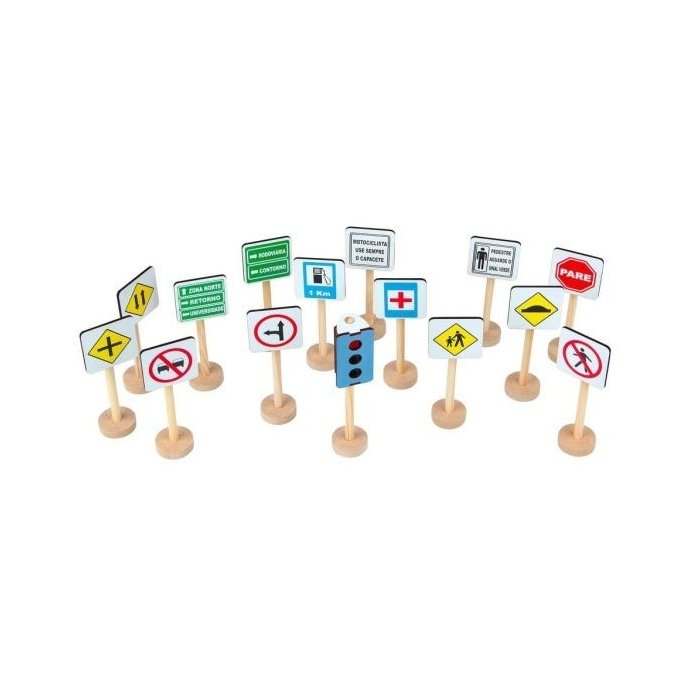 Jogo educativo mini kit de trânsito em MDF - 15 placas. Confeccionado em madeira e M.D.F., composto por 15 peças usinadas e recortadas a laser, sendo: 01 semáforo e 14 placas de sinalização, medindo aproximadamente 13,5 x 5 cm. Embalagem: Caixa de madeira medindo 40 x 20 x 6 cm. Lacrada com película de P.V.C. encolhível. CE-BRI/ICEPEX - N 00928-96