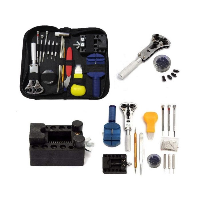 Com esse kit é possível fazer reparos gerais, como trocar o fundo do relógio, ajustar a pulseira, troca de bateria e trabalhos de precisão.