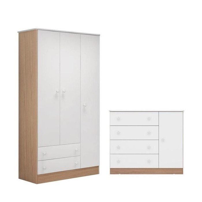 Jogo Infantil com Roupeiro 3 Portas e Cômoda Sapateira Branco Carvalho Móveis Leartam