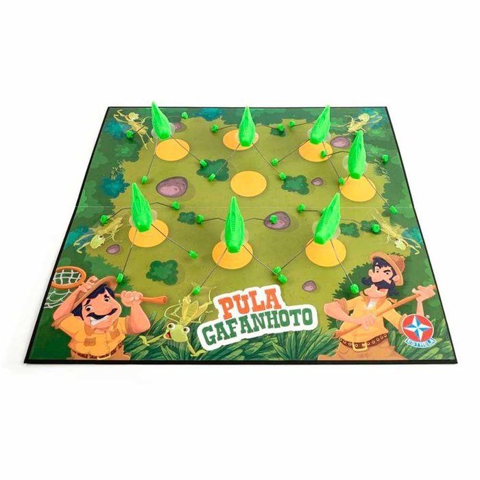 Jogo Infantil - Pula Gafanhoto - Estrela: Nessa disputa, os jogadores precisam ser rápidos e usar toda sua habilidade para capturar o maior número de gafanhotos. Um jogo com regras simples, mas com muita diversão! Aperte os gafanhotos no tabuleiro e espere! A qualquer momento eles vão pular! É gafanhoto para todo lado!Como jogar Pula Gafanhoto?Objetivo do Jogo- Capturar o maior número possível de gafanhotosPrepare a nuvem de gafanhotos do Jogo- Abra o tabuleiro em uma superfície plana. Coloque os oito gafanhotos sobre os círculos laranjas no tabuleiro- Obs: não pressione os gafanhotos no tabuleiro- Entregue uma rede para cada jogador. Antes de começar o jogo, decida quantas rodadas irão jogarOperação Pega Gafanhoto:- Cada jogador pressiona quatro gafanhotos, de forma que suas ventosas fiquem grudadas no tabuleiro. Em seguida, devem pegar rapidamente suas redes e esperar até eles começarem a pular. Mas preste atenção! Porque a qualquer momento os gafanhotos irão começar a pular... é pulo para cá, pulo para lá, em alturas e momentos diferentes. E os jogadores devem estar preparados para pegá-los com suas redes e não os deixar escapar!- Após os oito gafanhotos pularem, os jogadores contam quantos gafanhotos cada um capturou. O jogador que pegou mais gafanhotos é o vencedor daquela rodada! Se um gafanhoto (ou mais!) não foi capturado por nenhum dos jogadores, ele está fora da rodada e não vai participar da contagem. Caso haja um empate no número de gafanhotos pegos, os jogadores devem repetir a rodada até que haja um vencedor! No final, o jogador que tiver ganhado o maior número de rodadas é o vencedorInformações:- Produto: Jogo Pula Gafanhoto- Marca: Brinquedos Estrela- Tipo: Jogo Infantil- Categoria: Jogos e Tabuleiro- Tempo médio de jogo: 10 minutos ou a definir pelos jogadores- Objetivo do Jogo: Capturar o maior número possível de gafanhotos- Interatividade do Jogo: Ação- Participantes: para 2 jogadores- Conteúdo: - 01 tabuleiro- 02 redes- 08 gafanhotos,- Recomendação: para crianças a partir de 05 anos de idadeEspecificações:- Referência: 1001607100052- Código de Barras: 7896027559590- Embalagem (C x A x L): 35.5 x 21 x10 cm- Embalagem (Peso): 0.481 kg- Composição / Material: Plástico- Registro: 001809/2020- Certificado: Órgãos Autorizados - OCP´S (Organismos de Certificação de Produtos) Aviso: - As imagens são meramente ilustrativas- Os pesos, tamanhos e medidas são aproximados- As cores e estampas dos produtos podem ter variações- As informações são de responsabilidade do fabricante ou fornecedor