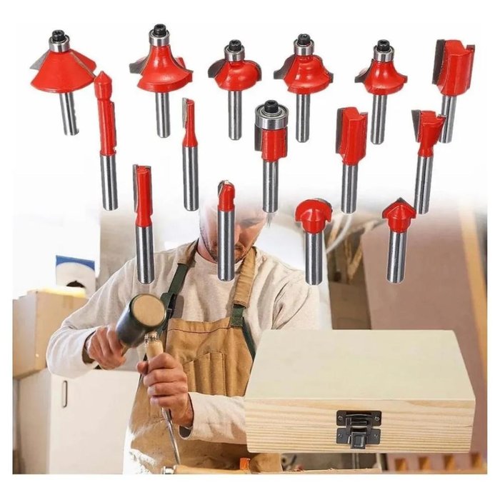 Jogo kit fresas pra tupia 15 pçs 6mm + estojo de madeira.