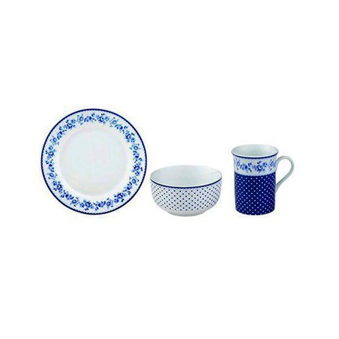 Ideal para utilizar no dia a dia, é fácil de levar para o trabalho ou para outro lugar. Você faz o lanche da tarde com estilo e com os lindos produtos da coleção Viena. - Lavar com água e detergente ou sabão neutro. - Não use abrasivos na limpeza. Conjunto para lanche produzido em porcelana. A cor branca transmite sensação de limpeza e paz, ideal para usar em qualquer peça ou cômodo da casa, já os detalhes floridos em tons de azul tornam a peça delicada e elegante. 1 caneca 1 prato de sobremesa 1 bowl