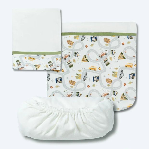 O Jogo de Lençol 3 Peças Hug traz conforto e cuidado para o quartinho do bebê. O kit possui um lençol de eslástico, uma fronha e sobre lençol com vira em suedine estampado. Além disso,o sbre lençol é ótimo para cobrir o bebê. Indicado para berço padrão americano.