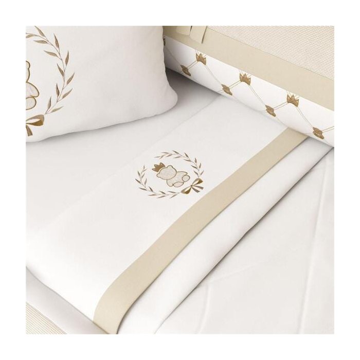 A vida começa com um sonho! Pensando nisso, criamos o Jogo de Lençol da Coleção Ursinho Clássico Palha, um conjuntinho especialmente para embalar as noites do pequeno ou pequena com um toque de carinho! Isso porque o tecido usado para confeccionar o acessório é 100% algodão e respeita a pele delicada do neném com maciez, proteção e muito conforto! São três peças essenciais no enxoval, como lençol de cima com bordado e vira, lençol de baixo com elástico liso e uma deliciosa fronha para apoiar a cabecinha delicada do recém nascido. O bom gosto da Grão de Gente aparece num design clássico e sofisticado, com um bordado exclusivo de ursinho, coroas e ramos de louro, além de uma faixa bege, que finaliza esse arranjo harmônico que agrada príncipes e princesas. Além de abraçar o neném com um toque de carinho e uma pitada de aconchego, esse modelo exclusivo coroa a decoração do quarto de bebê com todo o requinte quarto de bebê com o seu elegante bordado de ursinho coroado.