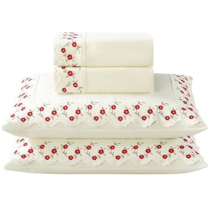 Jogo Lençol Casal Flores Bordado 4pç 100% Poliéster - M_verm