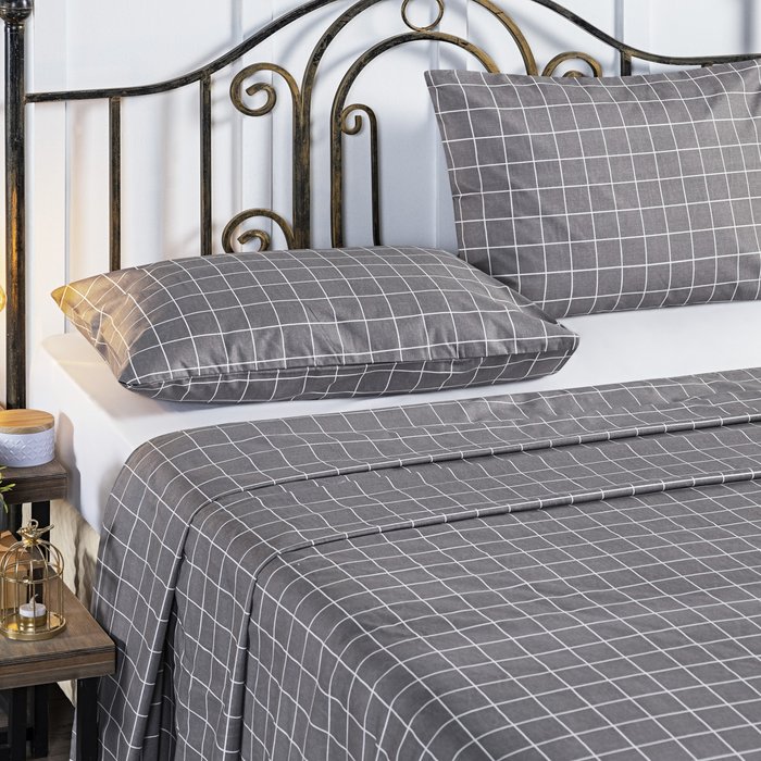 Jogo Lençol Casal Queen 4 Peças Percal 150 Fios 100% Algodão Fronha Elástico Toda Volta Grid Cinza Cinza