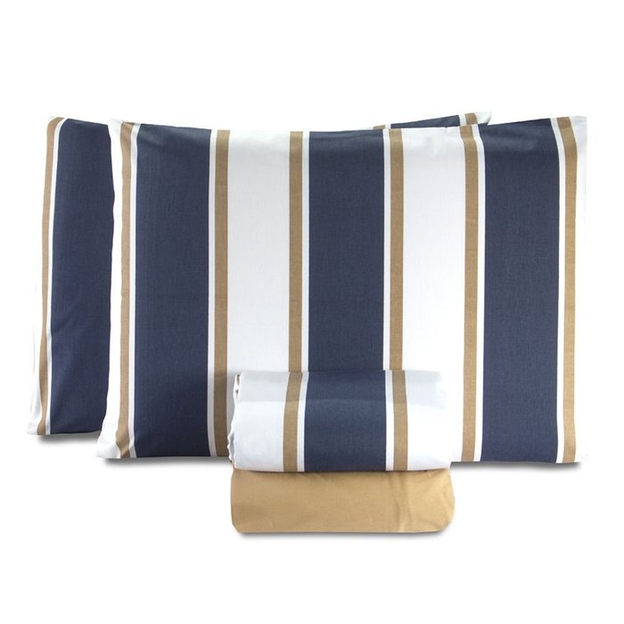 Jogo Lençol King 4 Peças 100% Algodão Percal 200 Fios Tous Les Jours:Listra Azul & Caqui