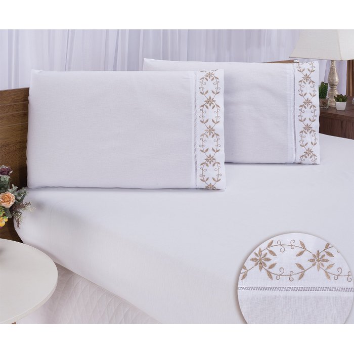 Jogo lençol Queen casal bordado 3 peças branco caqui veneza