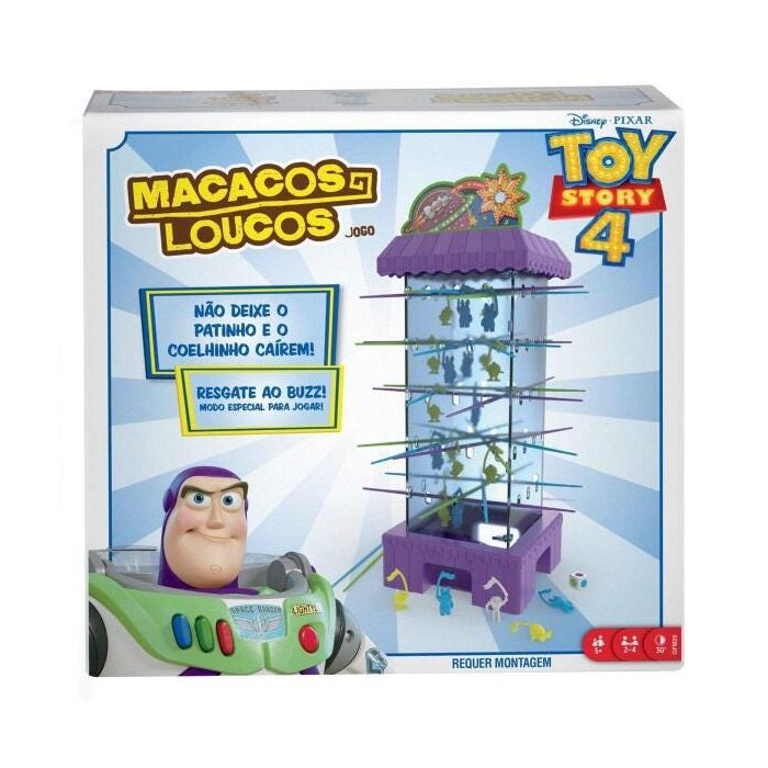 Com o Jogo Macacos Loucos Disney Pixar Toy Story 4 da Mattel a diversão é garantida. O jogo de destreza Tumblin que você ama, agora com o divertido tema Toy Story 4. Uma mão firme e um pouco de sorte percorrem um longo caminho neste clássico jogo infantil que é fácil de aprender e divertido de jogar. Crie uma teia de palitos na unidade de jogo e, em seguida, coloque as peças com temas de personagens dentro de onde elas ficarão penduradas nos palitos. Se revezem rolando o dado e removendo um palito - com a cor que o dado indicar. Tenha cuidado para não deixar as peças caírem o jogador que deixar cair menos ganha.