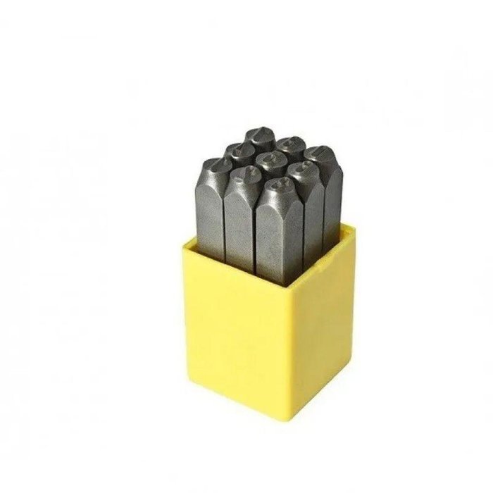 Jogo Marcação Punção Numérico - Med. 10,0mm - 9 peças O QUE É O PUNÇÃO NUMÉRICO Punções são marcadores fabricados em materiais bem rígidos. Sua estrutura é composta por uma haste em aço com um pequeno relevo em uma das pontas, sendo mais comum a silhuete de números entre 0 e 9, e letras entre A a Z, normalmente. São muito comuns em centros de usinagem, e todo tipo de empresa onde é necessário a demarcação de peças de forma rápido e precisa. PARA QUE SERVE OS PUNÇÕES NUMÉRICOS Os punções funcionam como forma de carimbo em peças. Eles criam uma pequena profundidade no objeto, formando o caractere desejado. COMO SE UTILIZAR O PUNÇÃO NUMÉRICO O Punção Numérico necessita de uma pressão externa para que se consiga realizar a marcação. Para isso, é necessário a utilização de um martelo.Com os dois itens em mãos, basta inclinar o pino em 90º e golpeá-lo com o martelo, de forma que ele consiga pressionar por completo na peça.É de extrema importância o uso dos EPI’S em todo o processo da operação. MEDIDAS PUNÇÃO NUMÉRICO - Quantidade De Peças: 9;