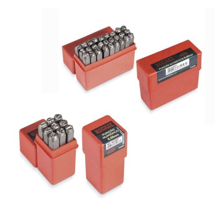 Jogo de punção com alfabeto completo de A até Z com tamanho de 6mm para marcação por batida em ferro e outros metais. Produto original Rocast e de altíssima qualidade. Marca: Rocast Características Jogo Marcador Pino Punção Letras Alfabeto (600017): -Alfabeto completo: A até Z. -Medida: 6mm. -Material: Aço. -Produto profissional e original Rocast. -Tratamento térmico. -Resistência e durabilidade elevada. Jogo Marcador Pino Punção Números (600007): -Números completos: 0 até 9. -O 6 e o 9 é o mesmo. -Medida: 6mm. -Material: Aço. -Produto profissional e original Rocast. -Tratamento térmico. -Resistência e durabilidade elevada. Conteúdo: -27 Peças (alfabeto completo). -9 Peças (números completos). -2 Estojos de plástico. Aplicação: Ideal para marcar e gravar em ferros e outros metais. Código: KIT840