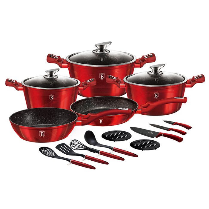 Jogo Panelas e Utensílios 17 Peças Tripla Camada de Mármore Burgundy Berlinger Haus Kit Gourmet Fogã Vermelho Metálico