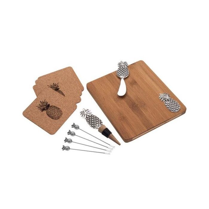 Jogo para Petisco Abacaxi Prateado - 30x30cm Um jogo completo para você, um kit para todas as refeições. Tem algo melhor que estar confortável e preparado para tudo? Deixe sua casa mais elegante e única, traga a praticidade e facilidade para sua mesa e aproveite o máximo sua ocasião! Composto por 11 peças, sendo 04 porta-copos, 01 rolha para garrafas, 01 espátula, 04 garfos para aperitivos e 01 tábua. Tábua - Largura: 30 cm x Altura: 3,5 cm x Profundidade: 30 cm Para maior durabilidade, limpar com panos macios e manter em locais seguros.