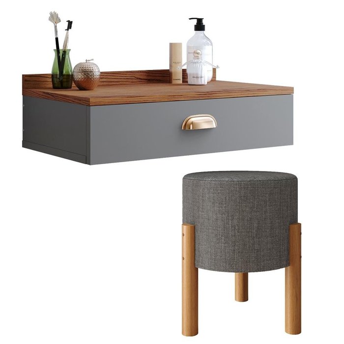 Jogo Quarto Gaveta Suspensa Penteadeira Camarim Puff Banqueta Estofada Redonda Cinza/freijó -rpm Cinza/freijó