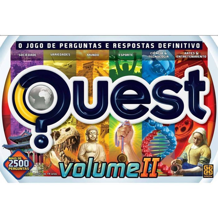 O Quest é um jogo para reunir toda a família! Quest Volume II traz 2.640 perguntas, divididas em 6 temas diferentes: Mundo, Artes e Entretenimeto, Sociedade, Ciência e Técnologia, Esporte e Lazer e Variedades. Antes de responder a cada pergunta, o jogador deve apostar a quantidade de casas que deseja andar no tabuleiro se acertar a resposta. Os jogadores podem ainda escolher os temas que mais conhecem para responder caso o peão caia em uma casa com dois temas.