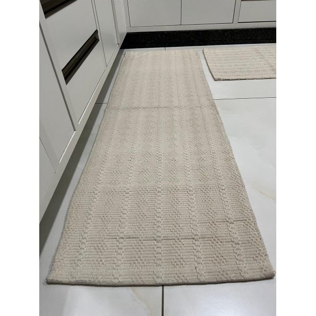Kit 3 peças em tear artesanal, perfeito para trazer aconchego e elegância ao ambiente. Produzido em 100% algodão, une beleza, resistência e toque macio, ideal para o dia a dia.O conjunto contém: * 1 passadeira – 1,40m x 40cm * 2 tapetes – 40cm x 60cmPeças feitas manualmente no tear, com acabamento cuidadoso que valoriza a decoração e proporciona charme rústico e sofisticado ao mesmo tempo. Instruções de limpeza: Pode ser lavado na máquina, utilizando sabão neutro.