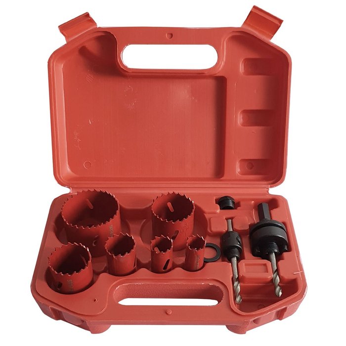 Jogo Serra Copo Bimetal 19 a 57mm 9 Peças Maleta Lotus Jogo Serra Copo Bimetal 19 a 57mm 9 Peças Maleta Lotus. Serras indicadas para perfurar metais, madeiras, alumínios e drywall - Marca: Lotus - Referência: 6123 - Jogo de 9 peças de serras copo Bimetal utilizada em metais, madeiras, alumínios e drywall - Possui borda construída em aço de alta velocidade e corpo em mola de aço. As duas seções são soldadas juntas para formar uma única lâmina. - As laminas de aço rápido são soldadas eletronicamente ao corpo de liga de aço para garantir dentes mais fortes e resistentes por muito mais tempo. - Orifícios de ventilação para resfriamento. - A borda endurecida resiste muito mais que uma lâmina de carbono padrão, enquanto o corpo de aço da mola permite mais flexão sem quebrar. - Pintura vermelha eletrostática - Altura das serras Copo: 1" (24mm) - Peso bruto: 960 gramas - Garantia: 90 dias Itens inclusos: - 1 Serra Copo 3/4" (19mm) - 1 Serra Copo 7/8" (22mm) - 1 Serra Copo 1-1/8" (28mm) - 1 Serra Copo 1-1/2" (38mm) - 1 Serra Copo 1-3/4" (44mm) - 1 Serra Copo 2-1/4"(57mm) - 2 Mandris de 1/4" (9/16", 1", 3/4") - 1 Adaptador com broca piloto - 1 Estojo