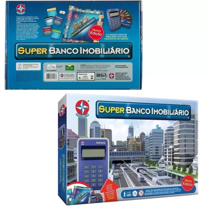 Jogo Super Banco Imobiliário - EstrelaAs crianças vão se divertir fazendo bons negócios. Com o Super Banco Imobiliário elas vão comprar e vender grandes empresas, propriedades e ações de renomadas companhias. Nesse jogo, os pequenos irão mostrar suas habilidades administrativas e empresariais. Basta se reunir com os amiguinhos e começar a brincadeira. O melhor negociador vence. Nessa versão, para comprar e vender no Super Banco Imobiliário, utiliza-se cartão de crédito em vez de notas de dinheiro. O jogo vem com uma máquina eletrônica de crédito e débito. Contém na embalagem: 1 tabuleiro, 28 títulos de posse, 6 cartões, 80 casas, 2 dados, 6 marcadores de metal, 1 máquina de cartão (pilhas não inclusas) e 1 manual de instruções. O tabuleiro é dividido em 4 partes.