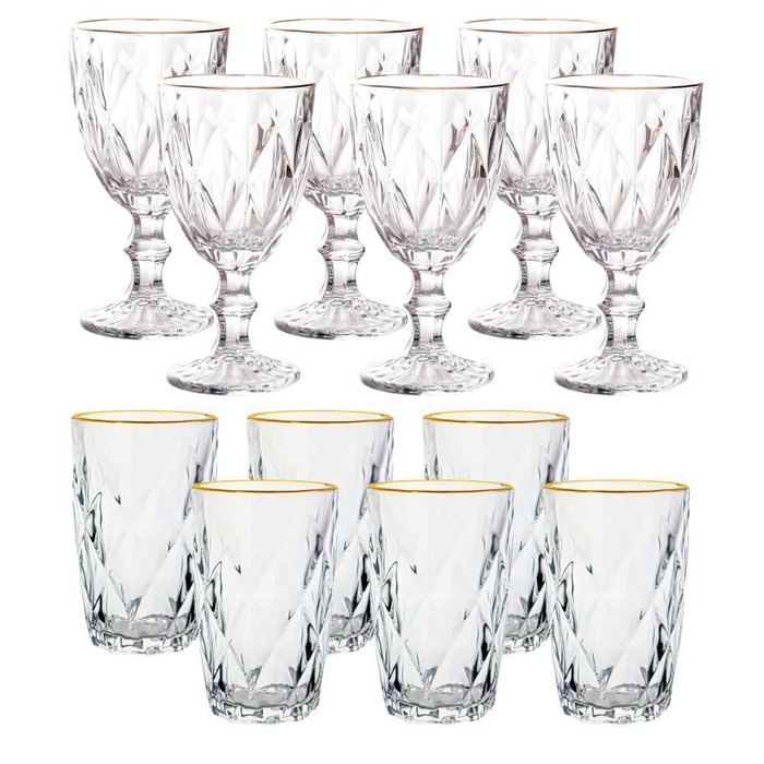 | Nome do desenho | Jogo taças e copos vidro diamond fio ouro 12 peças lyor 7988 |