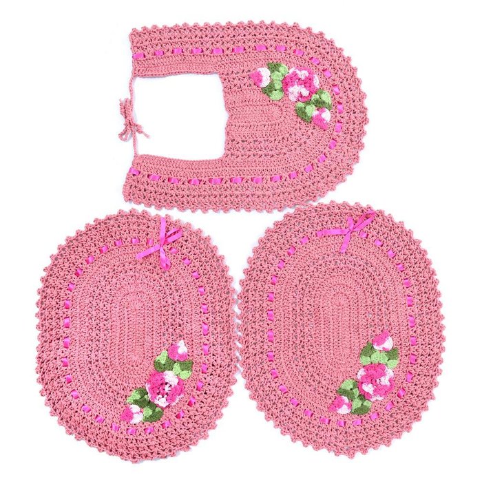 Jogo Tapete Banheiro Crochê 3 Peças Flores Algodão Decoração Rosa