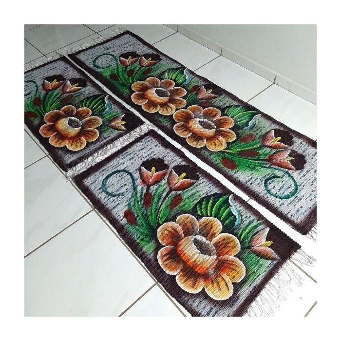 Jogo Tapete Cozinha 3 Peças Pintado À Mão Flores Mostarda 04