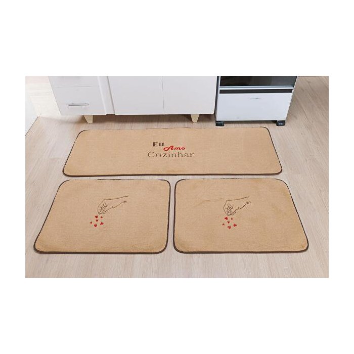 Jogo Tapete Cozinha Antiderrapante Amo Cozinhar Bege